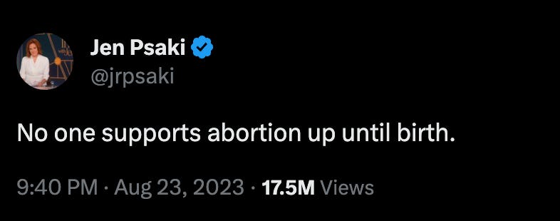 In a recent debate during the Republican National Convention, Florida Governor and presidential candidate Ron DeSantis sharply criticized what he described as the extreme stance of many Democrats on abortion. He asserted, "What the Democrats are trying to do on this issue is wrong, to allow abortion all the way up to the moment of birth." Almost immediately, former Biden press secretary Jen Psaki tweeted to X (formerly Twitter) saying, “No one supports abortion up until birth.”