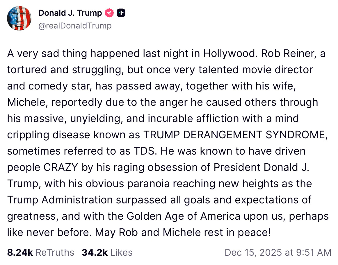 Thank you for what you wrote. I did not know any of Rob Reiner's views on the world or politics. I did not care. I was in awe of his talent in a complicated industry. I was so saddened when I read the words Trump posted. Again, I don't know if what is posted is really posted by him or by someone using his persona. (I am far from educated about social media.) It doesn't matter. It was bothersome. It is now more bothersome that the person alleged to have been the murderer was Rob Reiner's son. I don't normally comment on things, though this time I just needed to say something. Today, reading my Bible study, Ephesians 4:29 jumped out at me. "Let no corrupting talk come out of your mouths, but only such as is good for building up, as fits the occasion, that it may give grace to those who hear." I try to live these words every day. I pray these words can be heard and spread more, not just within my family and community, but also throughout the country.